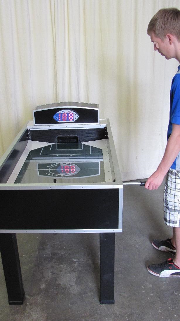 Ein speziell entworfener professioneller Tischfußballkicker mit einem Radargerät misst die Geschwindigkeit der Schüsse des jeweiligen Teilnehmer.